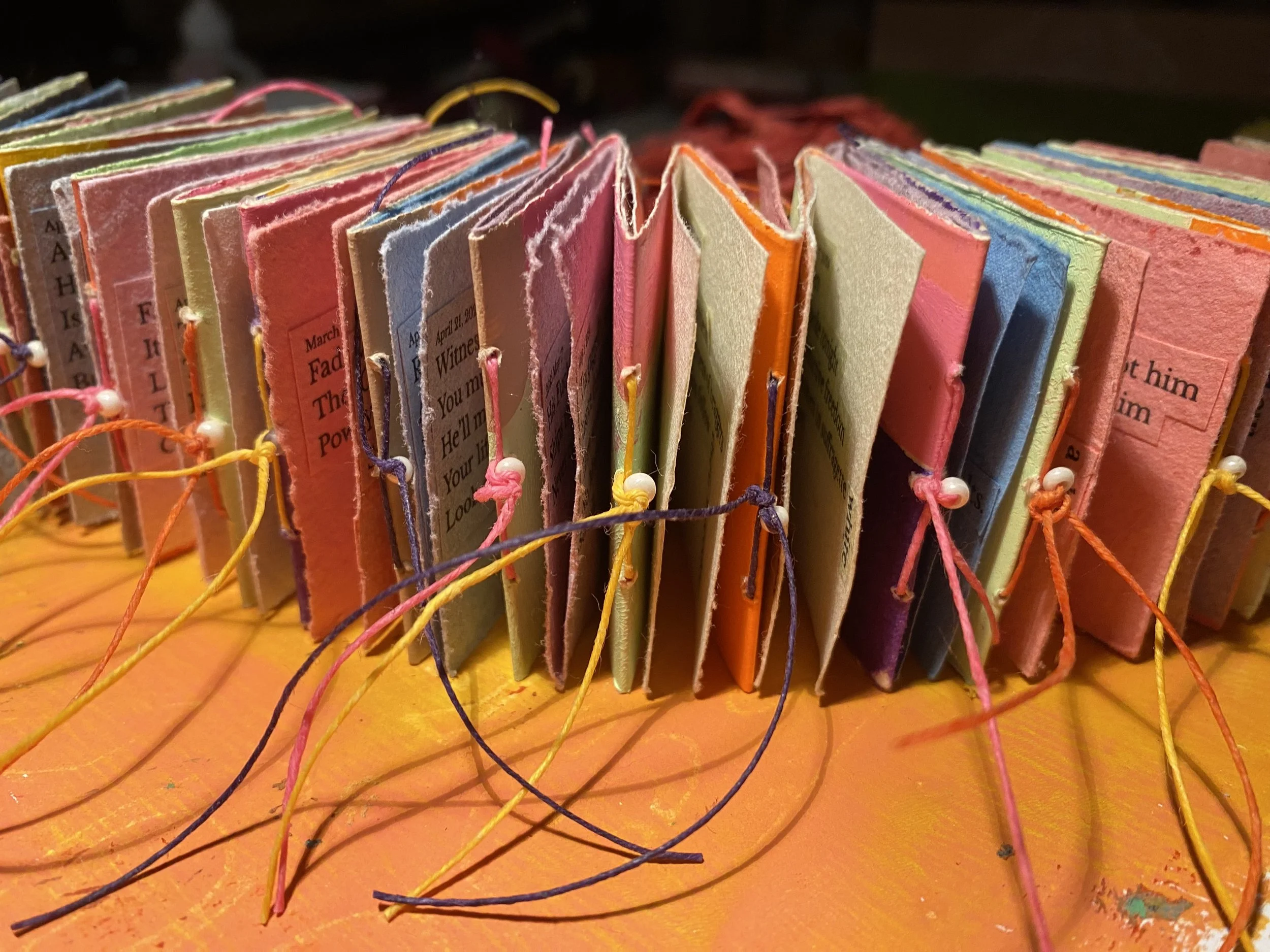 I participated, unofficially, in Instagram’s #100dayproject for the years 2023-25. I wrote Haiku daily for 100 days during the years 2023 and 2025. I wrote 100 Cinquains in the year 2025. As I looked at them I realized that many were in response to the Political Landscape of the time. I decided to make a small varied edition of 4 of these poems. The Haiku and Cinquain are dependent on syllables per line, which I followed. The text paper is handmade by me. The accordion fold base is card stock that I gel printed in the style of Sean Scully.