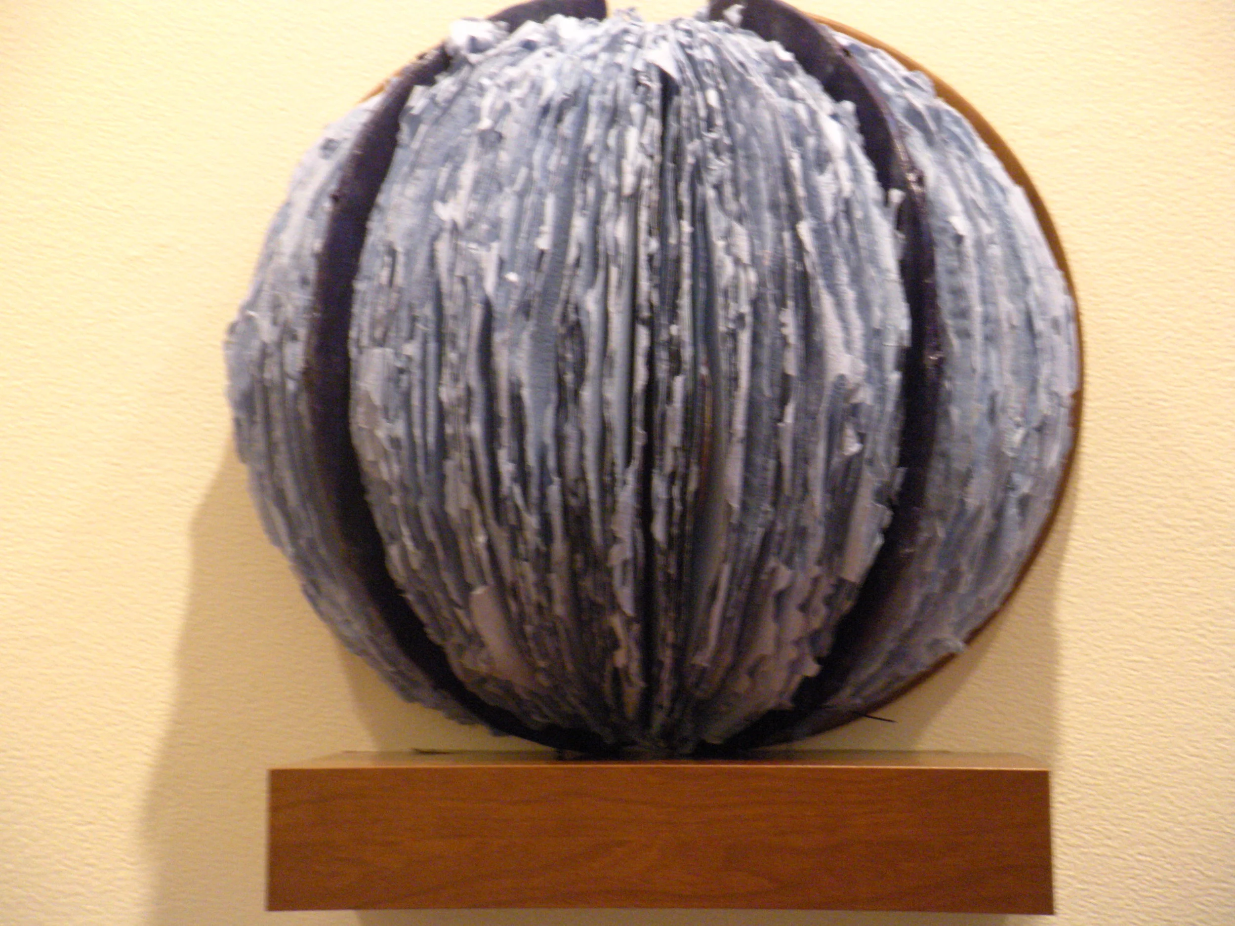 This book was made with folded round handmade paper and has a coptic stitch binding and walnut covers. I cut small circles out of my handmade paper and at different events I asked people to draw or write about peace on the circle. When they left their circle they got to choose a blank circle to take with them. I then made slits in the paper and inserted the circles. I made a system of identification of where I had collected the circles of peace. This piece exhibited at the Overture Center for the Arts.